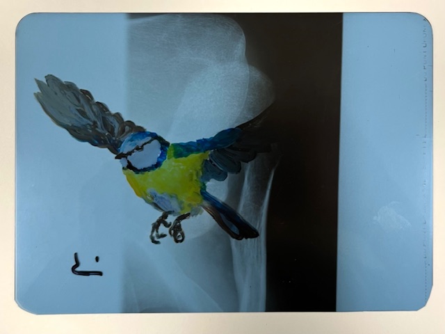 blue tit reverse 2025 acryl on Xray 11 x 17 cm